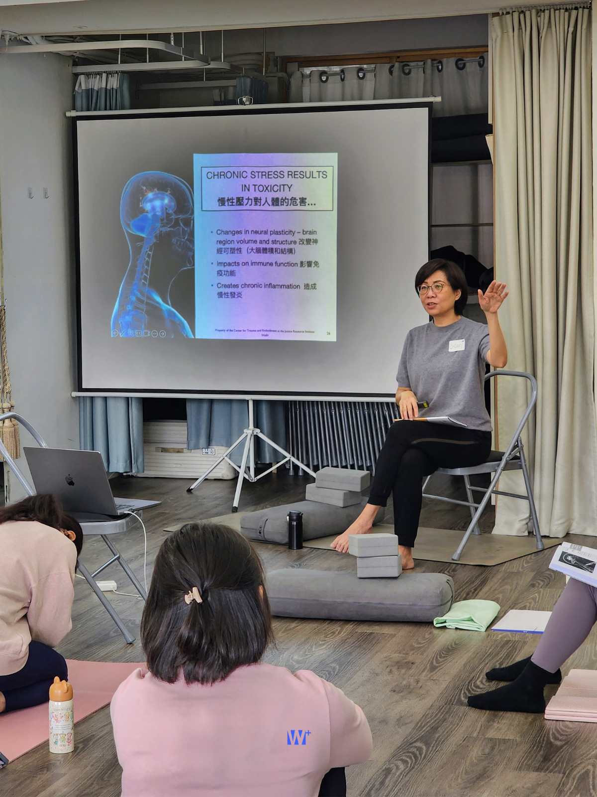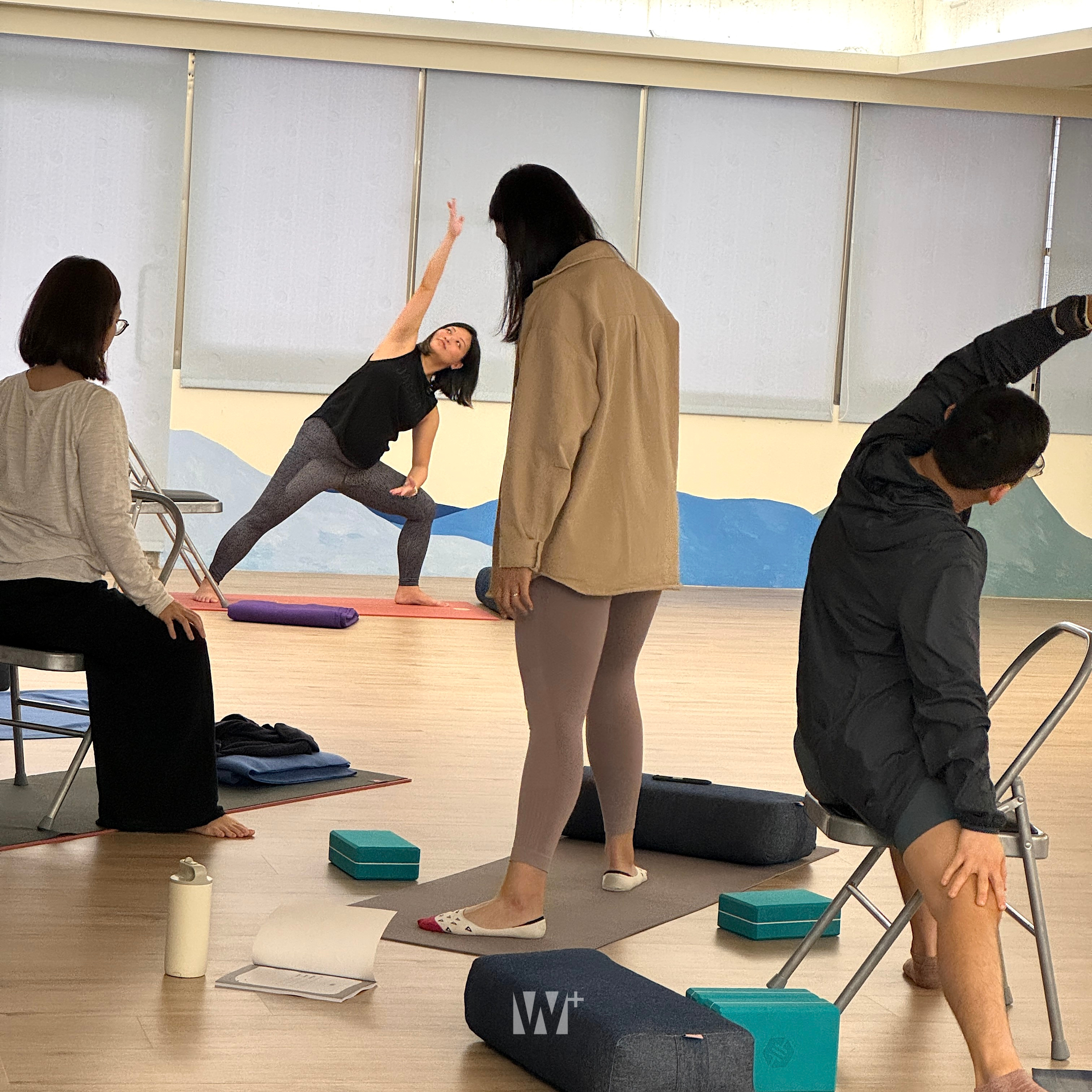 引導學員在安全的環境下,覺察身體的內感受。實作內容包含椅子瑜伽、墊上與站姿練習,以及對呼吸的探索